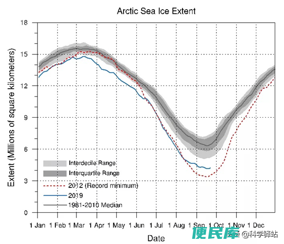 2019年9月17日,北冰洋海冰范围达到了2019年的最小值,约为415万平方公里,比1980-2010年期间的气候平均值(628万平方公里)小约34%。